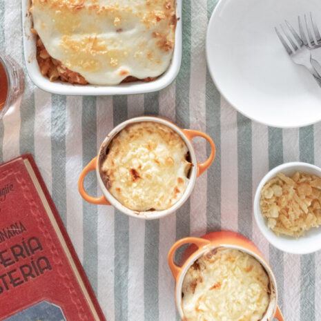 - Añadimos una buena capa de bechamel y queso, o de queso directamente sobre la pasta y horneamos hasta que la superficie del queso esté crujiente y dorada.